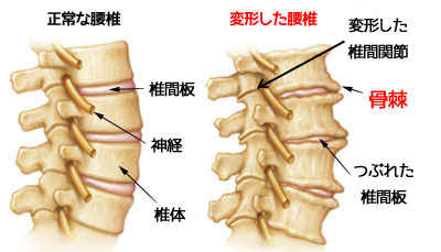 腰椎に見られる変形性変化の代表は、椎体の角に棘やくちばし状 の骨が出てくる骨棘形成です。進行すると、上下の椎体の骨赫がつながって、あたかも橋を架けたようになってしまう ことがあります。